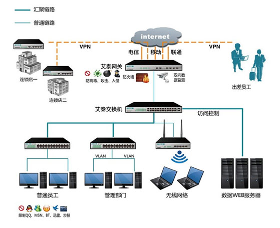 隨著經(jīng)濟(jì)的發(fā)展,連鎖經(jīng)營在全國得到了大規(guī)模的發(fā)展。連鎖經(jīng)營模式的重點(diǎn)在零售、餐飲和服務(wù)三個行業(yè)。其中,零售行業(yè)是連鎖經(jīng)營應(yīng)用為成熟的行業(yè),餐飲業(yè)特許經(jīng)營的發(fā)展也不可小視,服務(wù)業(yè)的連鎖經(jīng)營作為連鎖經(jīng)營新的拓展領(lǐng)域,發(fā)展勢頭十分強(qiáng)勁。特別是加入了加入世界貿(mào)易組織后,我國將與世界進(jìn)步進(jìn)一步的融合,勢必,行業(yè)競爭將更加激烈,它為我國連鎖經(jīng)營的發(fā)展注入了新的動力。而完善的物流配送體系的建立將解決長期以來制約我國連鎖企業(yè)發(fā)展的瓶頸問題。艾泰科技向客戶提供優(yōu)秀的網(wǎng)絡(luò)設(shè)備和解決方案。其開發(fā)的VPN產(chǎn)品能夠充分利用現(xiàn)有的網(wǎng)絡(luò)資源,提供經(jīng)濟(jì),靈活的聯(lián)網(wǎng)方式,為客戶節(jié)省設(shè)備、人員和管理所需的投資,能夠利用無處不在的Internet通過單一網(wǎng)絡(luò)結(jié)構(gòu)為各連鎖店間提供無縫和安全的連接,減輕了企業(yè)遠(yuǎn)程訪問費(fèi)用的負(fù)擔(dān),并且提供了安全的端到端的數(shù)據(jù)通訊。