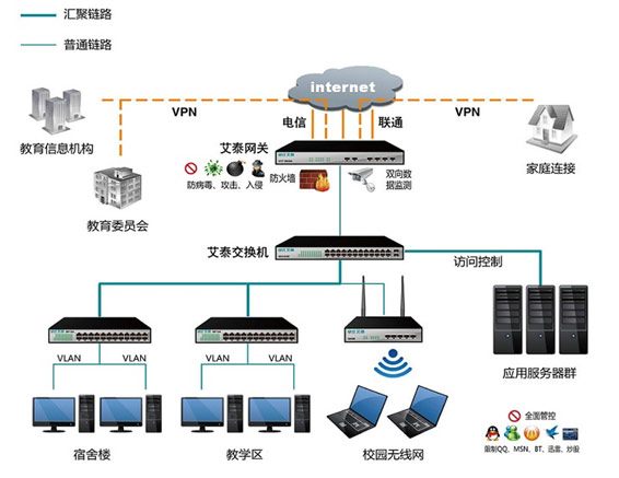 "科教興國(guó)"是保證我國(guó)能夠長(zhǎng)期、穩(wěn)定、高速發(fā)展的戰(zhàn)略國(guó)策,教育信息化是達(dá)成該戰(zhàn)略國(guó)策的重要手段之一,因此教育信息化工作受到了國(guó)家各級(jí)教育主管部門的高度重視。但是實(shí)際情況是經(jīng)費(fèi)朝大學(xué)傾斜,因此,如何利用比較少的資源實(shí)現(xiàn)中小學(xué)的信息化,這是我們關(guān)注的重點(diǎn),況且,中小學(xué)作為基礎(chǔ)教育的階段,更是需要普及信息化。網(wǎng)絡(luò)給教育帶來(lái)的好處不言而喻。艾泰科技提供一套安全、穩(wěn)定、“綠色”的網(wǎng)絡(luò)解決方案。