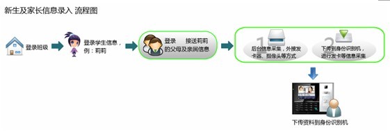 校園新生及家長(zhǎng)信息錄入: 新生入學(xué),學(xué)生與家長(zhǎng)到校務(wù)辦進(jìn)行信息采集。以本機(jī)采集為例,家長(zhǎng)信息錄入以后傳輸?shù)阶R(shí)別機(jī),然后在識(shí)別機(jī)上進(jìn)行發(fā)卡及照片采集,采集完成后,軟件進(jìn)行信息匯總,卡號(hào)及照片存入數(shù)據(jù)庫(kù)。后期可增加家長(zhǎng)信息數(shù)量,大數(shù)量為10個(gè)。