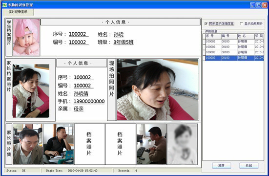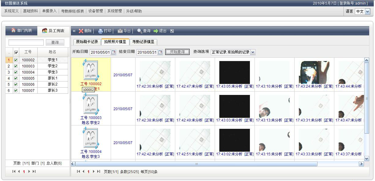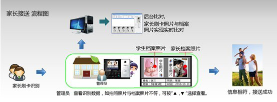 家長(zhǎng)接送: 設(shè)備安裝于門(mén)衛(wèi)室旁,家長(zhǎng)進(jìn)門(mén)時(shí),首先進(jìn)行刷卡,家長(zhǎng)刷卡以后,管理員現(xiàn)場(chǎng)查看刷卡信息,比對(duì)照片,如與檔案照片不符(因小孩可能對(duì)應(yīng)多位家長(zhǎng)接送),則按“↑”與“↓”鍵,查看所屬其他家長(zhǎng)照片,查到該家長(zhǎng)照片則完成接送。 后臺(tái)管理員可實(shí)時(shí)查看刷卡數(shù)據(jù),實(shí)現(xiàn)實(shí)時(shí)查看。