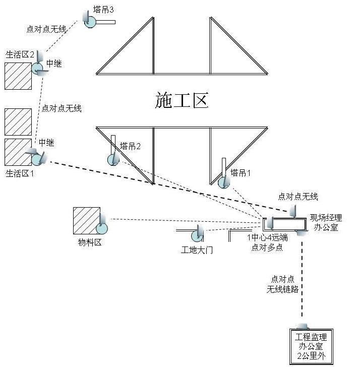 為保證某項(xiàng)目工程安全順利進(jìn)行,公司管理人員能夠及時了解施工現(xiàn)場情況和施工進(jìn)度,在工程現(xiàn)場安裝了合肥環(huán)宇智能工程有限公司的5.8GHz室外點(diǎn)對點(diǎn)、點(diǎn)對多點(diǎn)無線視頻監(jiān)控系統(tǒng),該系統(tǒng)由合肥監(jiān)控公司環(huán)宇智能的點(diǎn)對點(diǎn)、點(diǎn)對多點(diǎn)無線網(wǎng)橋和200W網(wǎng)絡(luò)高速球組成。