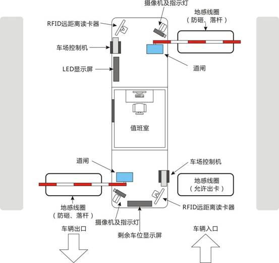 車輛入場(chǎng)時(shí),司機(jī)將所持有的本車場(chǎng)IC/ID 卡放在入口控制機(jī)的讀卡區(qū)域前讀卡,如果讀卡有效,道閘的閘桿自動(dòng)抬起,允許車輛進(jìn)入,車輛通過(guò)入口處的道閘后,閘桿自動(dòng)下落,封閉入口車道。