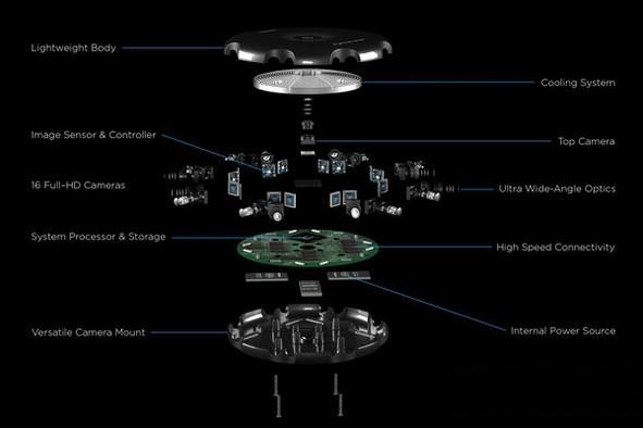 Beyond相機(jī)呈圓形,邊緣分布了16個(gè)高清攝像頭,能拍攝360度全景3D影像,并將各攝像頭所拍攝到的內(nèi)容拼接到一起,合成完整視頻,然后可以通過Gear VR進(jìn)行觀看。